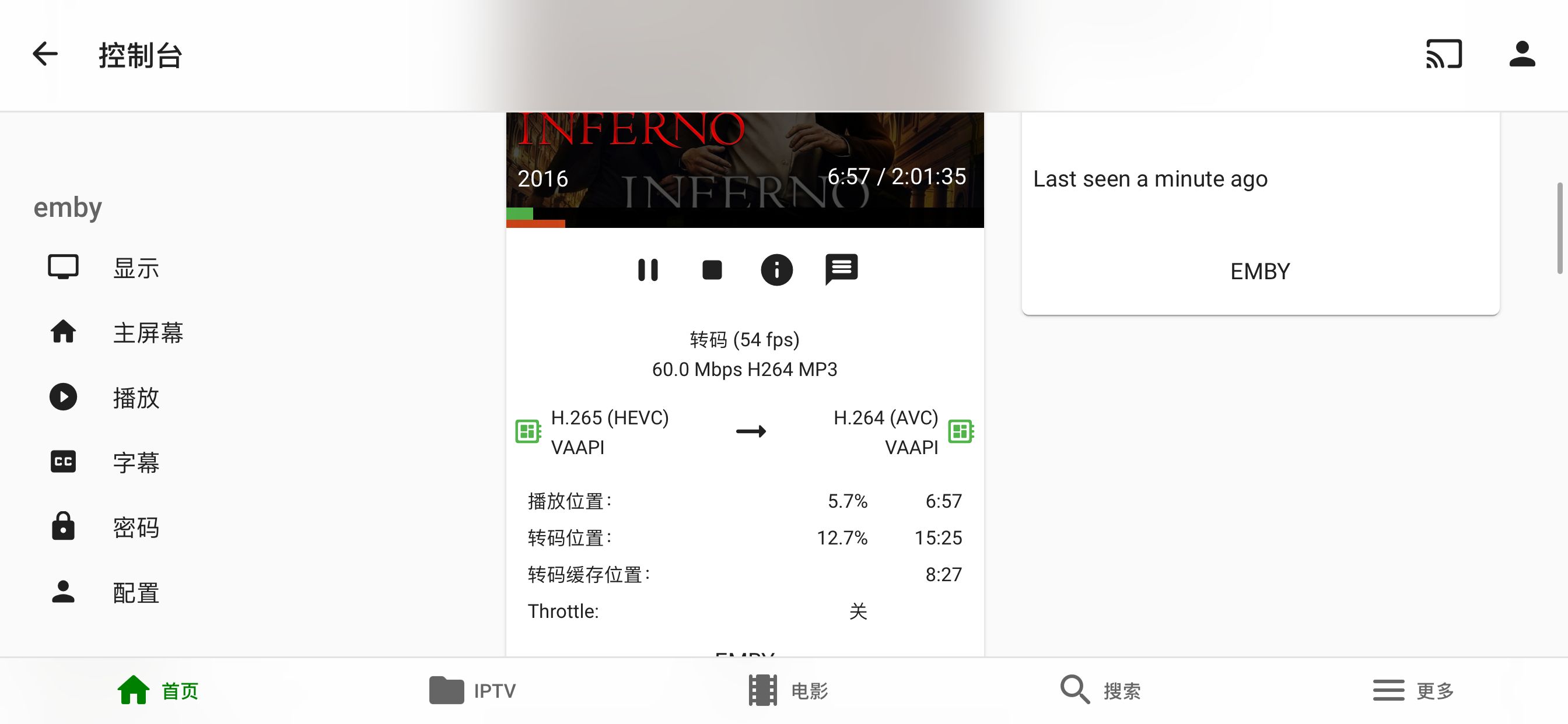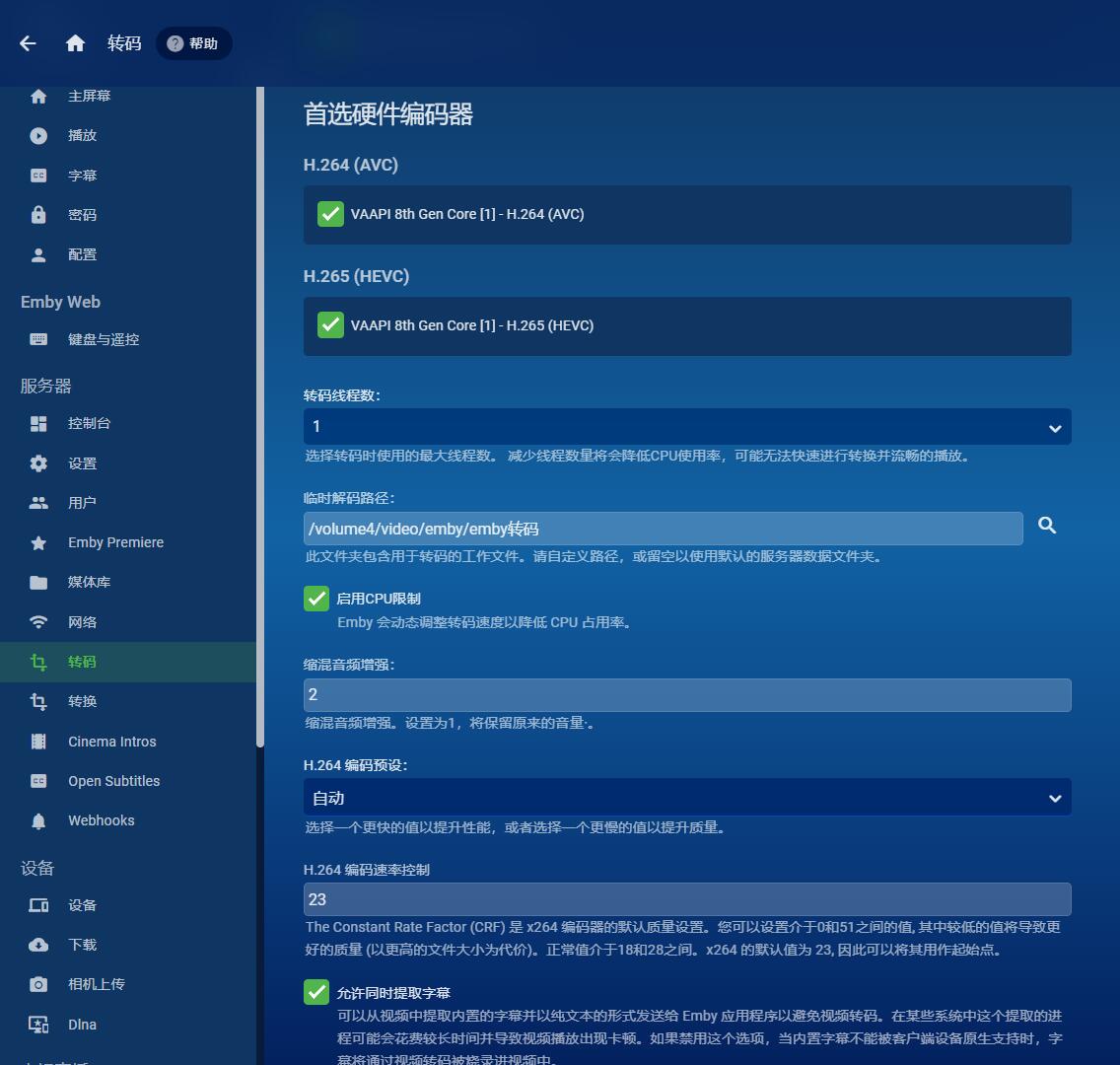 2、EMBY开启硬件解码后,在EMBY后台控制面板首页,可以看到有VAAPI字样;