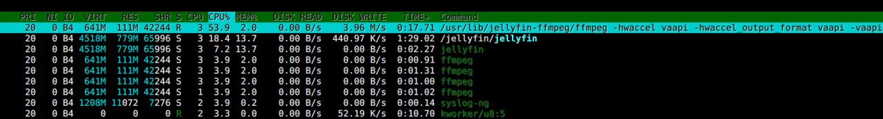 3、JELLYFIN开启硬件解码后,在后台控制面板首页,也会看到与EMBY类似的VAAPI字样。如果在Win系统用Xshell以root用户登录群晖SSH状态下,输入top,看到JELLYFIN的任务写有vaapi -hwaccel字样;