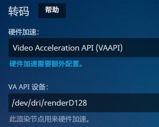 3、在JELLYFIN的转码里面,在“硬件加速”这里选择“Video Acceleration API(VAAPI)”,在“VA API设备”这里选择“/dev/dri/renderD128“;