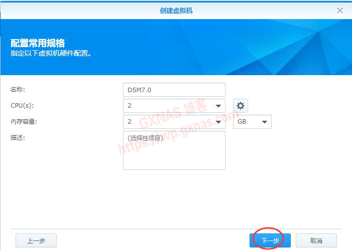 九、配置常用规格(分配给DSM7.0的配置),填写名称,分配CPU核心,分配内存,下一步;