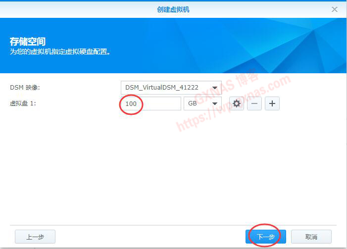 十、存储空间,虚拟盘1,根据自己实际情况给DSM7.0分配一个硬盘容量(我这就玩玩而已,只分配了100G),下一步;