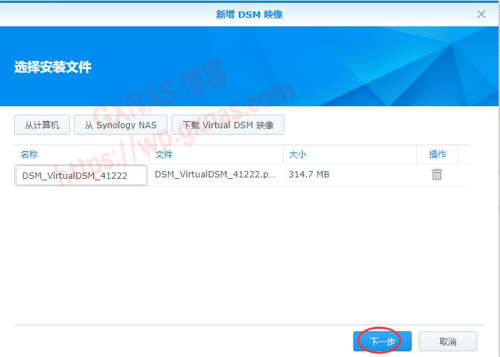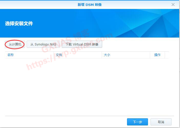 四、由于我已经事先下载好DSM7.0的安装包,所以我这选择“从计算机”,选好文件上传,下一步;