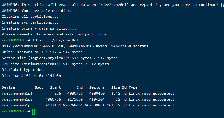 如果你的群晖版本是DSM7.X版本,需要先按照《黑群晖DS918-7.X开启NVME缓存的方法》教程识别到nvme,才可以敲命令建立存储。