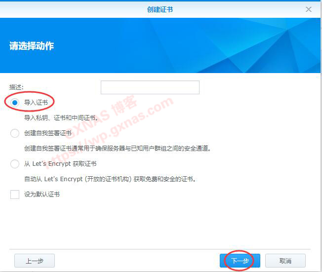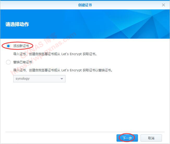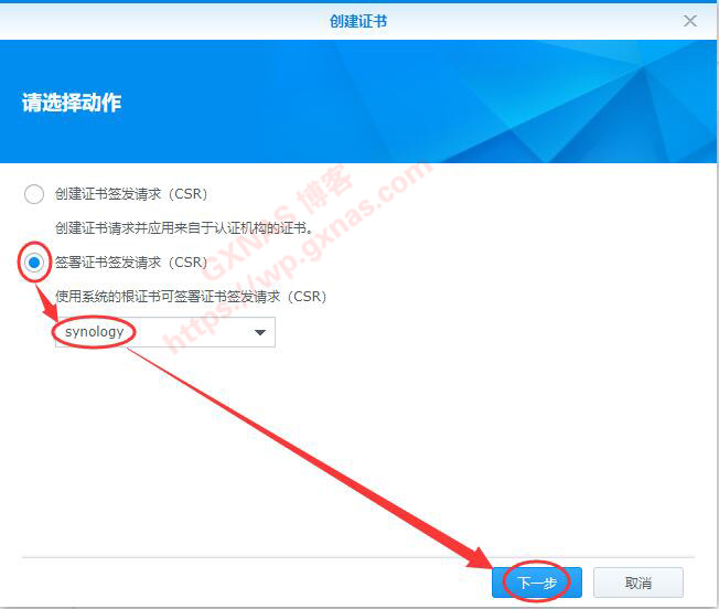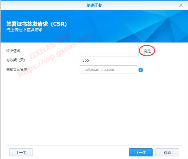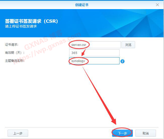 找到刚才在电脑上解压出来的文件“server.csr”,打开。然后在主题备选名称写上一个名称,我写的是“synology”,点:下一步。