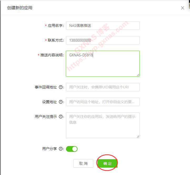 四、填写好应用名字,联系方式(可以随便写一个手机号),推送内容说明,确定;