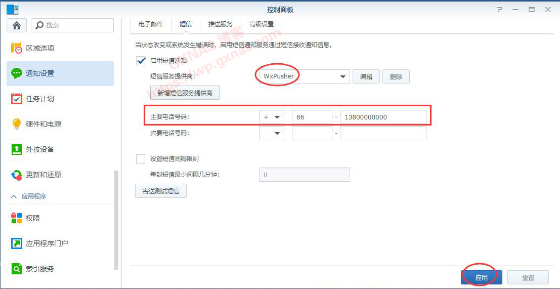 十二、在群晖控制面板—通知设置—短信,打勾“启用短信通知”,短信服务提供商选择刚刚创建的“WxPusher”,在下方的主要电话号码设置一个电话号码(这个电话号码按照手机号码格式随便写,并非用此号码发送短信,所以不用担心费用问题),应用;