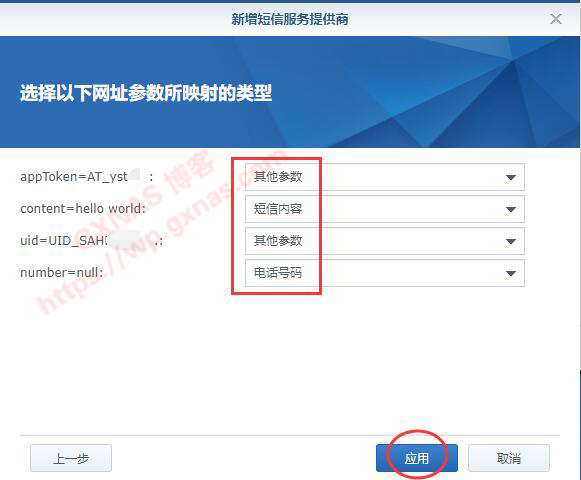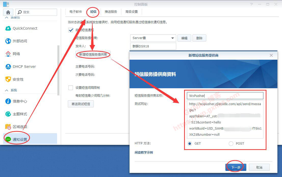 九、到群晖控制面板-通知设置-短信,新建短信服务提供商,短信服务提供商名称写“WxPusher”,测试网址写(“你的appToken”和"你的UID",请自行更换成第五步和第八步获取到的值):