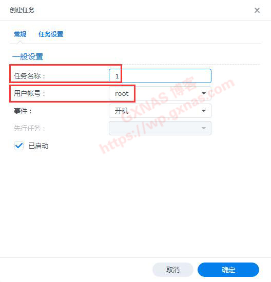 2、任务名称自己写一下(不能用中文),用户账号改为 root ;
