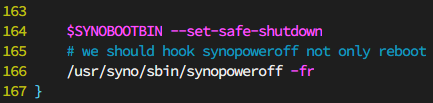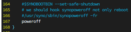 由于群晖系统连接的 UPS ,默认是是市电断电后进入“安全模式”,硬盘挂起并不会自动关机,如果 UPS 的功率太低的话,UPS 电池耗尽,UPS 就会给群晖“强制”断电,造成群晖再开机时会显示非法关机。这样的关机方式对硬盘是有损坏的,所以想实现当市电断电的时候,让群晖“正常”的关机。此时,需要先在“群晖控制面板”—“终端机和SNMP”—“启用SSH功能”上打勾,启用SSH功能,然后在Windows电脑上,使用SSH软件以root用户登录群晖,修改 /usr/syno/bin/synoups 文件,DSM6.X的版本找第 166 行的“/usr/syno/sbin/synopoweroff -fr”,DSM7.1的系统在第171行左右、DSM7.2的系统在第185行左右的内容“/usr/syno/sbin/synopoweroff -s &”: