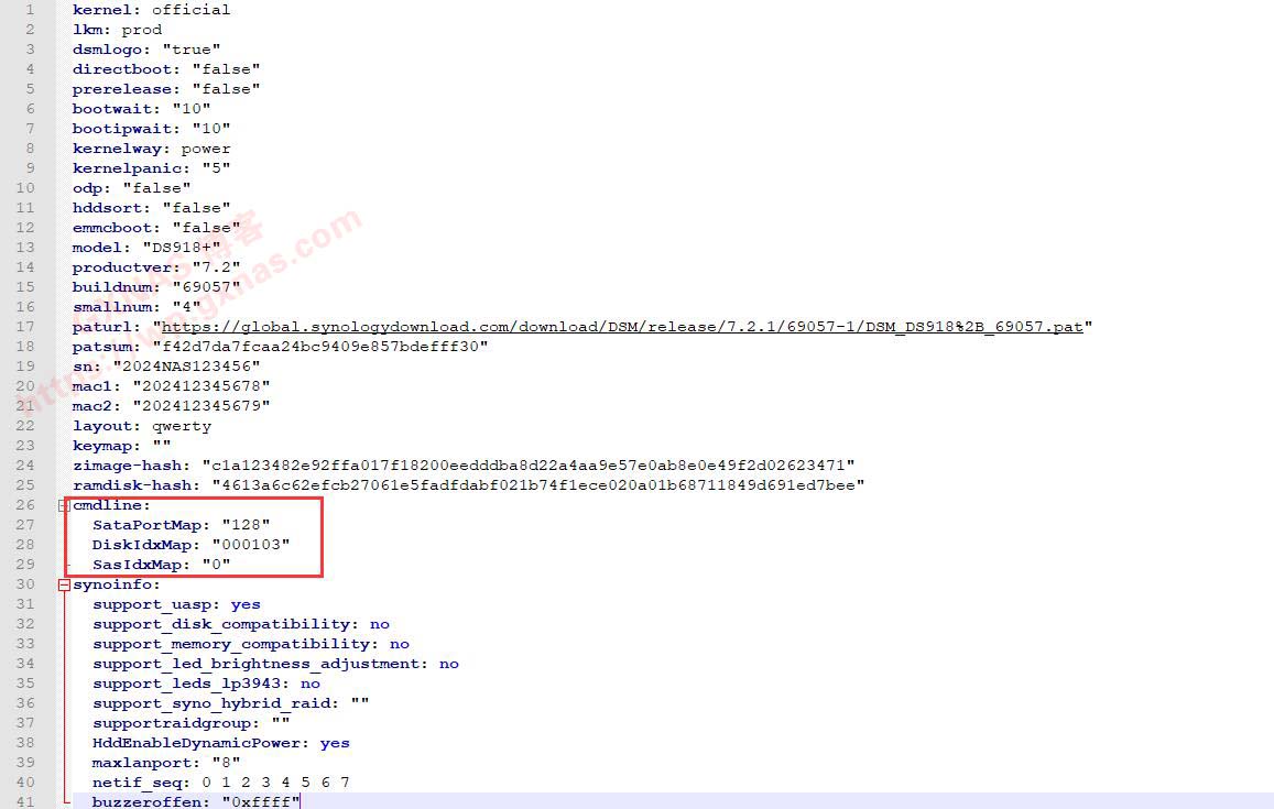#在群辉系统中,一个控制器默认只能控制9个硬盘,所以SataPortMap=的数值范围只能是0-9,0则表示屏蔽该控制器,不可以设为SataPortMap=0来隐藏引导盘!