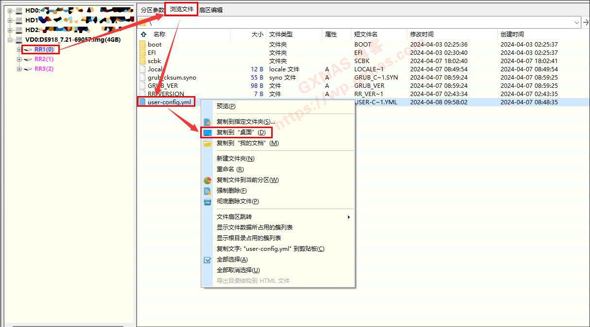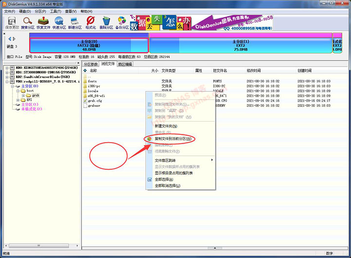 14、切换到刚才打开的DiskGenius,在右边grub.cfg(2024年9月5日更新:7.21和7.22的引导,修改引导盘根目录的user-config.yml)的空白区域点鼠标右键,复制文件到当前分区。