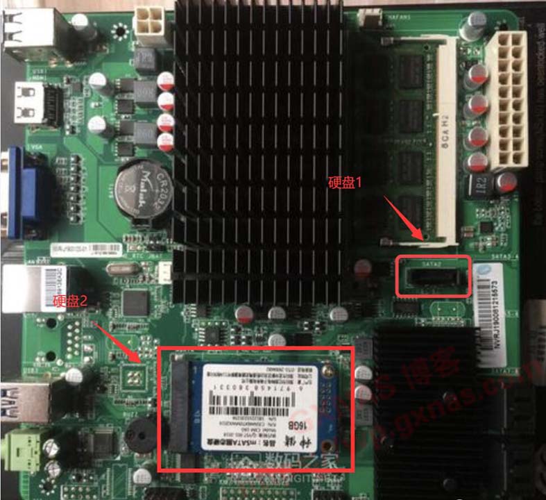 1、由于蜗牛星际这个机器的SATA接口比较奇特,所以在安装群晖系统之前,需要先一下准备工作:就是需要拆开机箱,在下图硬盘1的SATA口,需要接上硬盘,硬盘的电源从蜗牛主机背板电源口用大4pin一分二的线转接出来,再接一个大4pin转SATA的线,安装好群晖系统以后,这个硬盘还要一直接着,不可以拆走。(2024年9月5日更新:使用博主编译的7.21引导和7.22引导,已经不需要做此步骤)