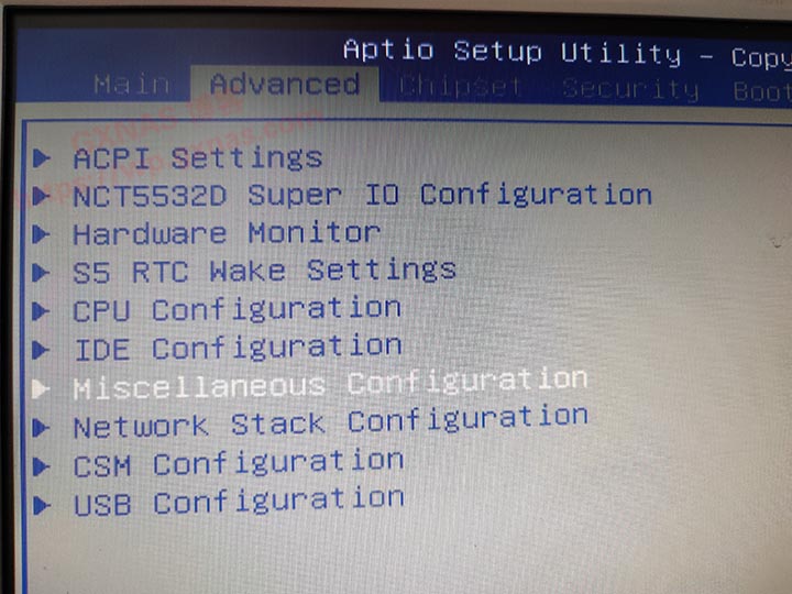 28、把U盘拨出来,拿到蜗牛星际插上,开机后狂按del键,进入BIOS设置界面,在Advanced菜单栏找到Miscellaneous Configuration。