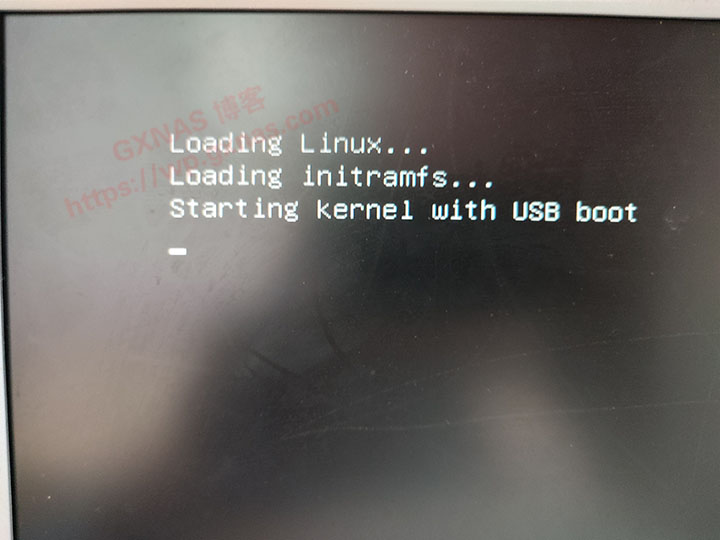 34、然后屏幕显示这三行内容以后就停在这里了,这是DSM7.X引导的正常启动界面。有可能这个画面保持几分钟后会进入黑屏状态(实际上是自动屏保了),不要以为是系统卡死了或者以为是死机了。(2024年9月5日更新:7.21或7.22的引导启动完成后,屏幕上会显示有IP地址);