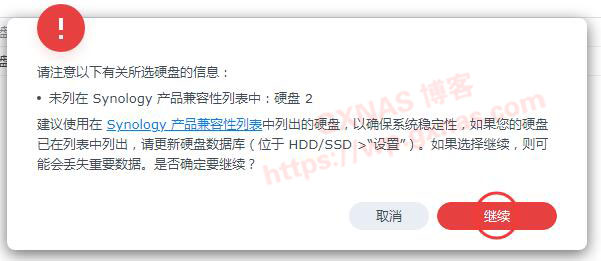 74、提示我的硬盘不在Synology产品兼容列表中,不用理会,这个不影响使用,继续。