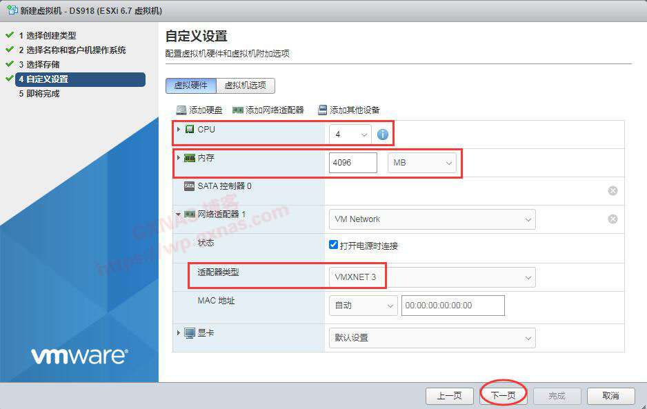 32、根据实际的情况选择配置,我这选择是四核心CPU,内存4096MB,网络适配器选择的是“VMXNET3”(如果你选VMXNET3发现不出IP的话,可以改成E1000e),同时删除多余的SCSI控制器、USB控制器、CD/DVD驱动器以及默认的硬盘,下一页。