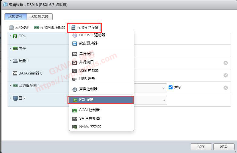 2、需要添加SATA控制器来达到直通硬盘的,在菜单上点添加其他设备,PCI设备;