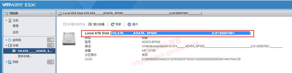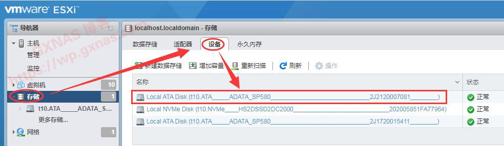 1、在ESXI菜单“存储”—“设备”,找到要添加给群晖的硬盘,点进去;