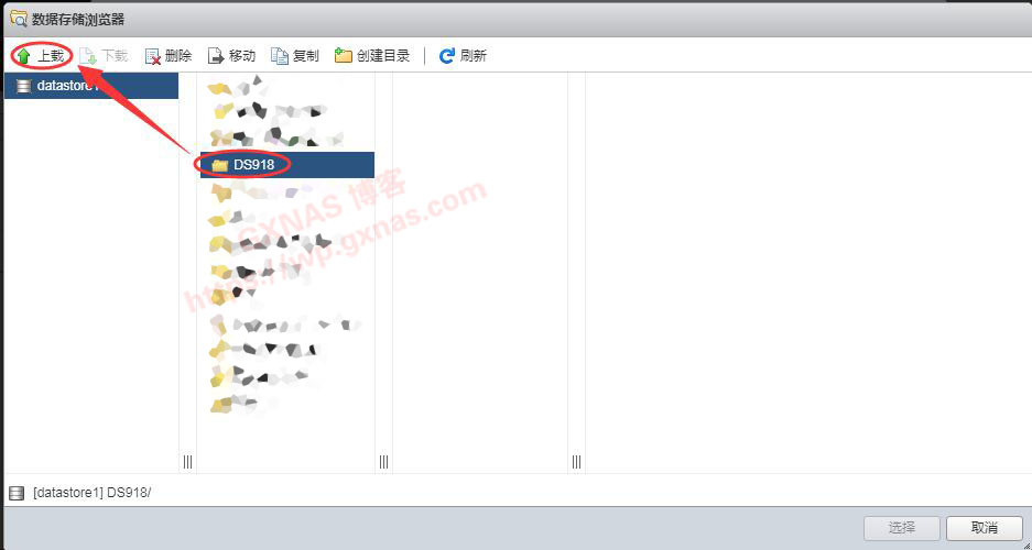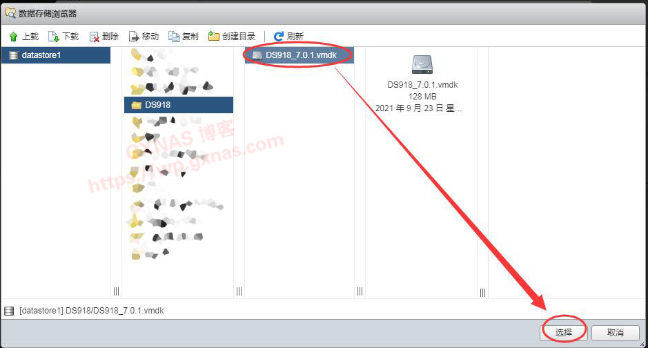 40、稍等一会,等文件上传完成后,会显示有DS918_7.0.1.vmdk(DS918_7.0.1-flat.vmdk这个文件不在这显示,属于正常现象),点这个文件,选择;
