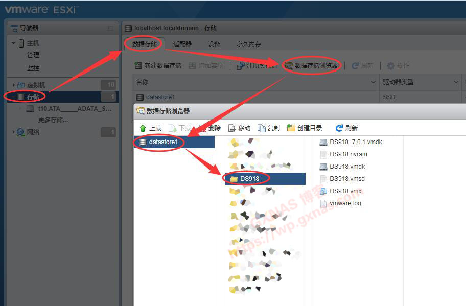 3、在ESXI菜单“存储”—“数据存储”,点“数据存储浏览器”,查看并记下虚拟机保存的路径,比如我的是在“datastore1”(ESXI的存储名称)的“DS918”文件夹(虚拟机的路径);
