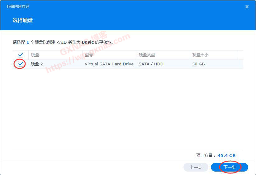 72、RAID类型根据实际选择(如果有多个硬盘需要组阵列的选SHR,如果需要把多个硬盘组成一个大容量的选JBOD),我这只有单硬盘,选Basic,下一步;