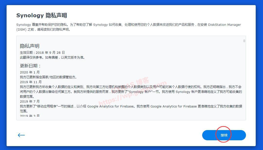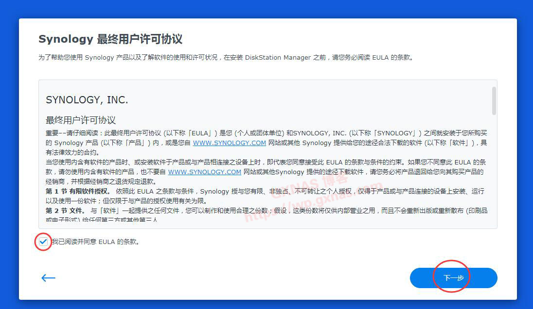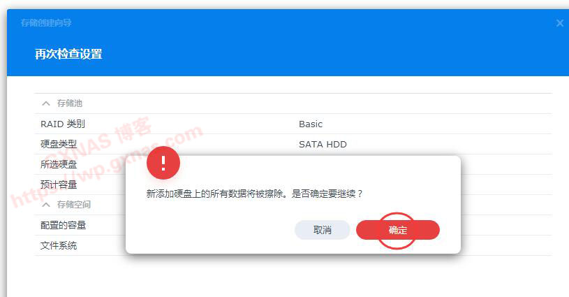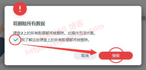 59、安装过程中,群晖系统会自动把存储硬盘重新分区并格式化为群晖格式的硬盘,在“我了解这些硬盘上的所有数据都将被删除”打勾,继续;