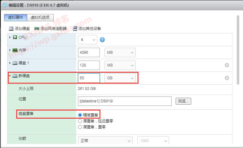 43、根据需设置需要用的存储盘大小(DSM7.X存储硬盘最低要求为19GB,如果小于19GB安装必定失败,本教程以50GB为例),磁盘置备我选的是“精简置备”;