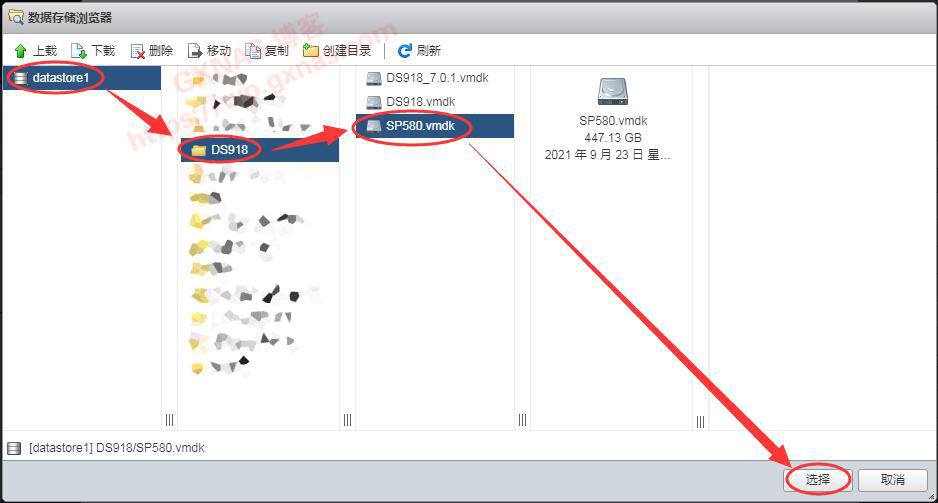 (4)SP580.vmdk是这个硬盘添加给群晖虚拟机挂载的名称(这个名称不可以和现有文件重名哦,否则文件会被覆盖后会造成虚拟机无法正常运行)