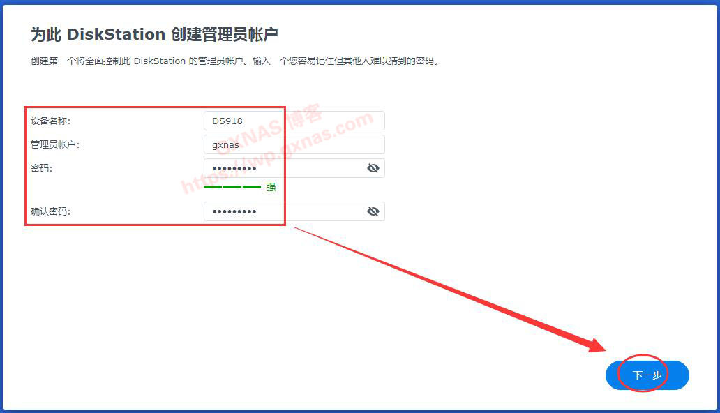 66、给设备起个名字(不可以用中文),设置一个用户名(不可以用admin),设置密码(密码要求:大写字母+小写字母+数字的组合,长度至少8位),下一步。