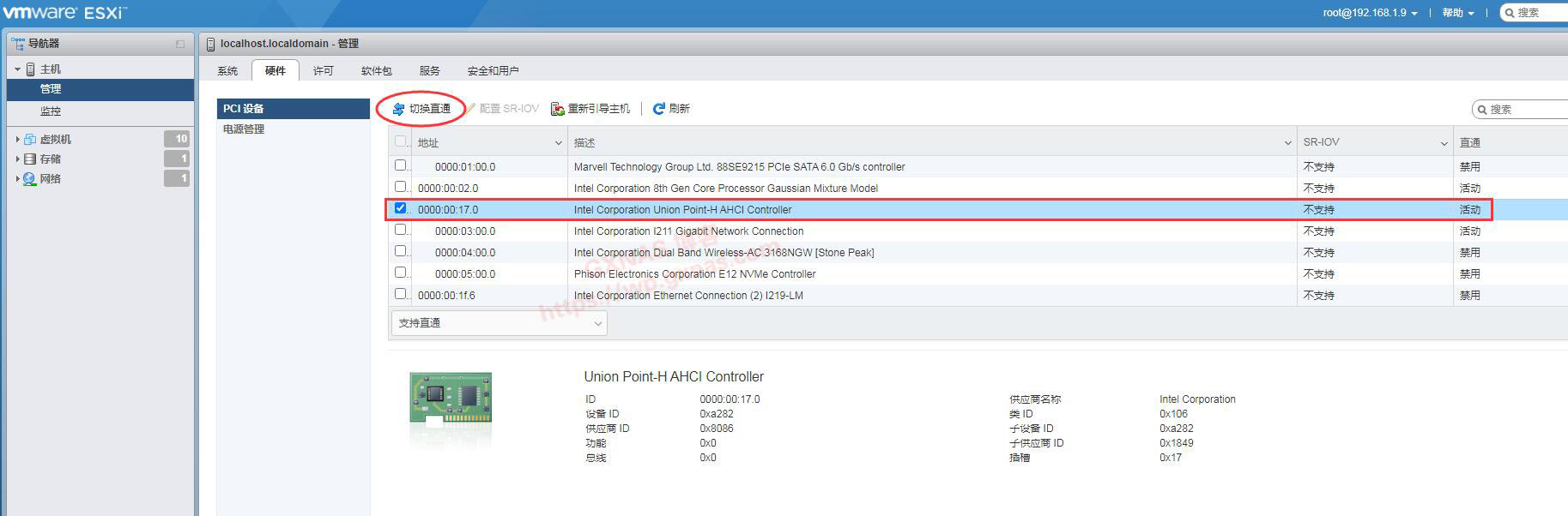 1、在ESXI菜单“管理”—“硬件”—“PCI设备 ”,找到SATA控制器,点菜单“切换直通”,重启ESXI后,此SATA控制器的“直通”菜单显示为“活动”;