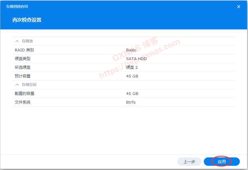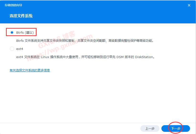 77、“选择文件系统”这里有两个选择,根据实际情况选择,如果想要使用群晖系统所有功能不受限制的,选Btrfs,下一步。