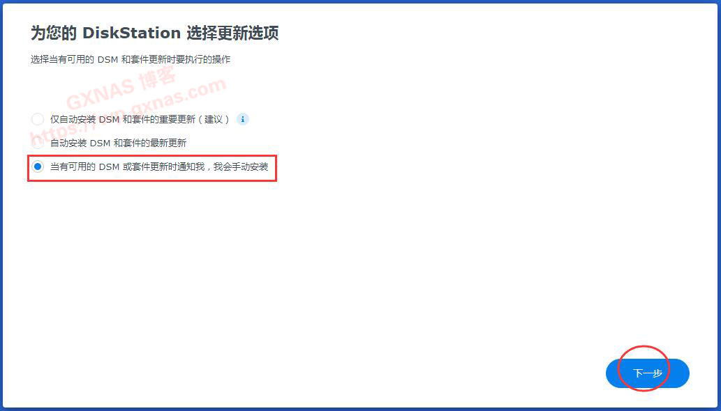 67、选“当有可用的DSM或者套件更新时通知我,我会手动安装”,下一步。