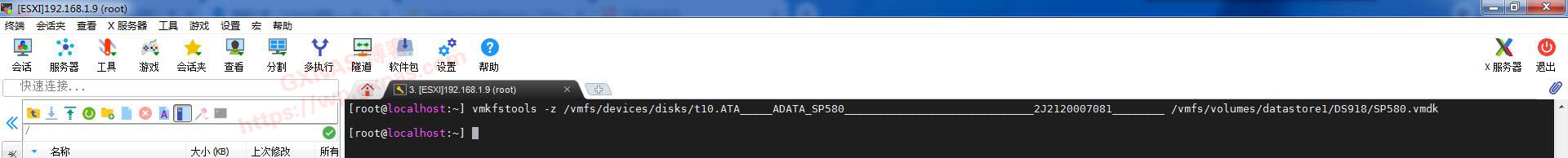 5、在电脑上打开SSH工具,以root用户登录到ESXI的SSH下,输入RDM直通的命令: