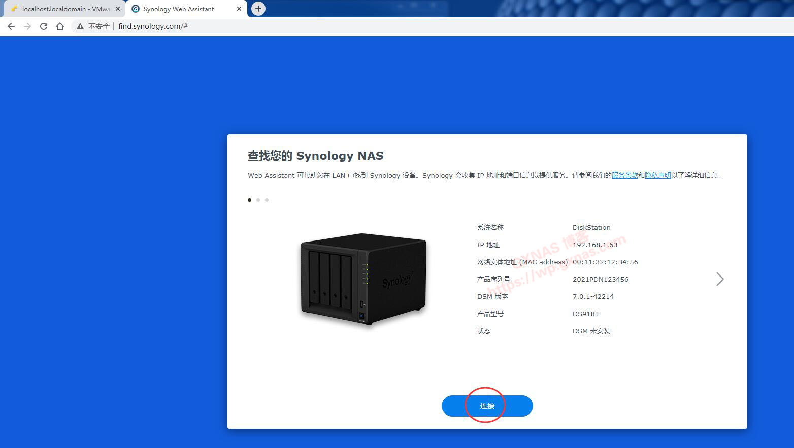 51、如果局域网内有多台群晖设备的,右边会有一个三角形显示,可以翻页找到我们需要安装的设备(状态会显示:未安装),点“连接”;