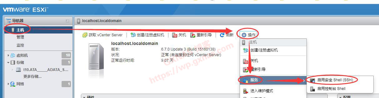 4、在ESXI菜单“主机”—“操作”—“服务”,选“启用安全Shell(SSH)”;