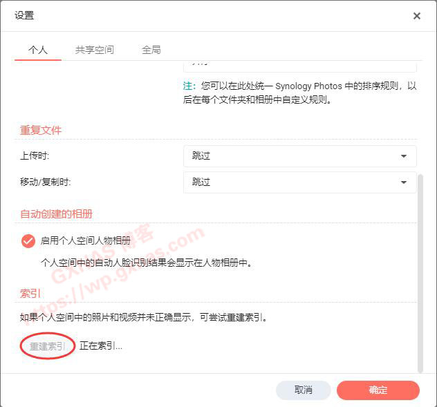 四、在浏览器打开Synonlogy Photos,在右上角设置菜单,点”重建索引“,耐心等待;