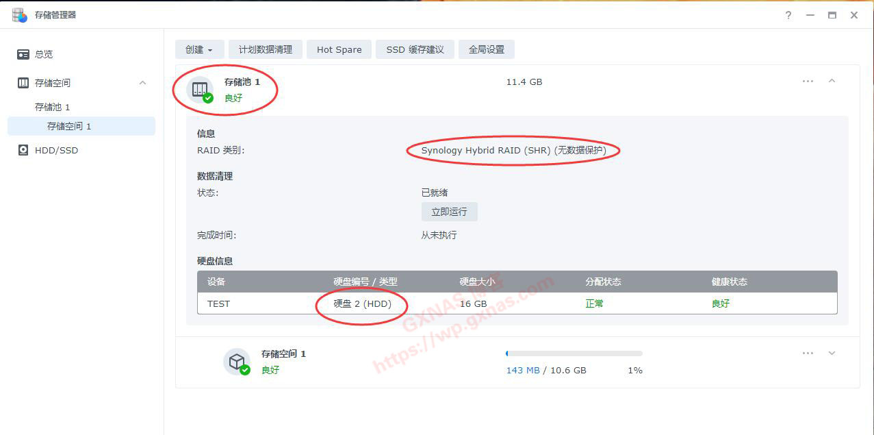 11、回到存储管理器,刷新一下网页,可以看到当前的硬盘之前是提示“堪用”,现在已经变成“良好”了,类型从SHR(带1个容错硬盘)变成SHR(无数据保护);