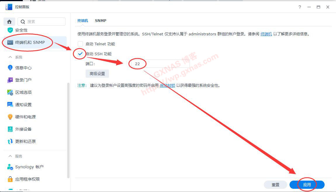 7、群晖控制面板,终端机和SNMP,在“启用SSH功能”打勾,设置一个端口号(默认端口为22,建议改成4位数字的端口号),应用;