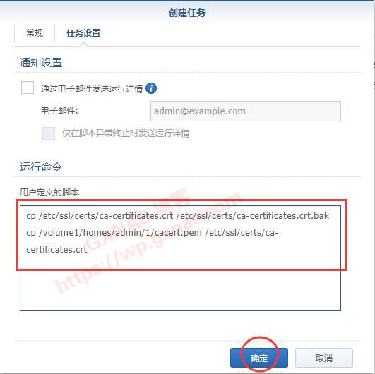 13、把以下的脚本复制一下(不要全部照搬,/volume1/homes/admin/1/cacert.pem为第10个步骤复制的路径),根据实际路径修改好,粘贴放到下图的位置后,点一下“确定”: