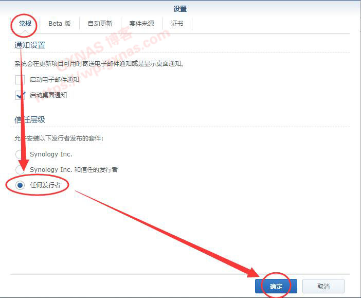 20、在套件中心,设置,在“允许安装以下发行者发布的套件”中选择“任何发行者”,确定;