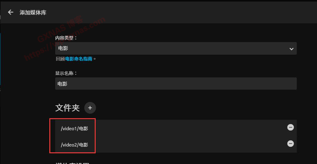 (2)根据需要添加影视文件所在的文件夹,比如我的NAS有两个影视的文件夹,所以设置了"video1"和"video2"两个装载路径,这个装载路径可以自己定义名称;