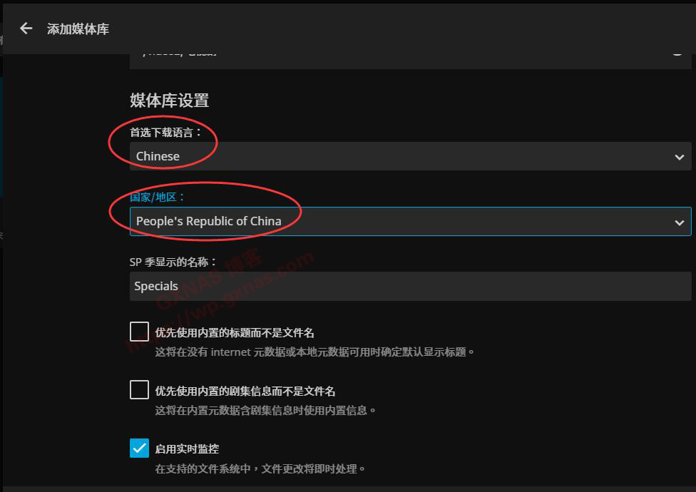 40、下向滚动菜单,找到媒体库设置,首选下载语言选“Chinese”,国家/地区选择“People's Republic of China”;