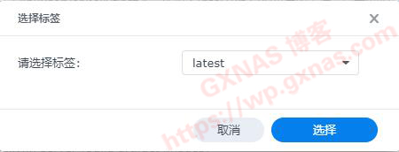 6、“请选择标签”这里默认为“latest”即最新版本,点“选择”(latest版本默认不含核显驱动,如果需要群晖开启核显硬解的请下载latest-legacy版本);