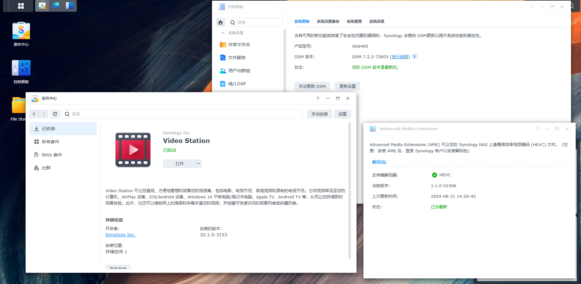 2、Advanced Media Extensions (AME)、File Station、媒体服务器、Surveillance Station、Synology Drive、Universal Search、Synology Photos 、Snapshot Replication 将自动更新至最新版本(如果之前装有AME和Surveillance这两个套件并启用开心版的,升级后就不开心了);