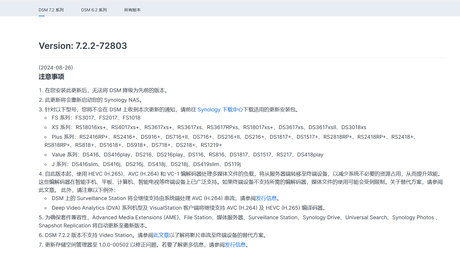 2024年8月26日,群晖官网推出了【DSM7.22-72803版本】,重点有三点:
