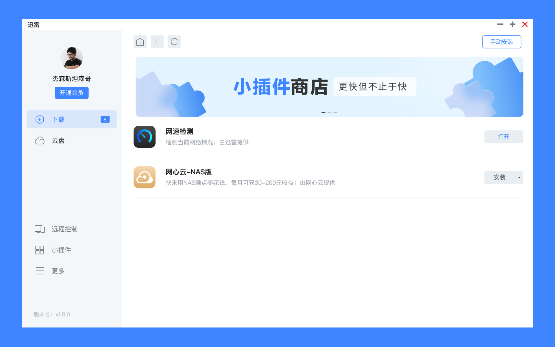 5、支持迅雷小插件商店,可根据需要自主安装小插件:比如可以装个网速检测的插件,看看NAS接入的网络是否畅通、网速是否达标、网络延迟是否过高。