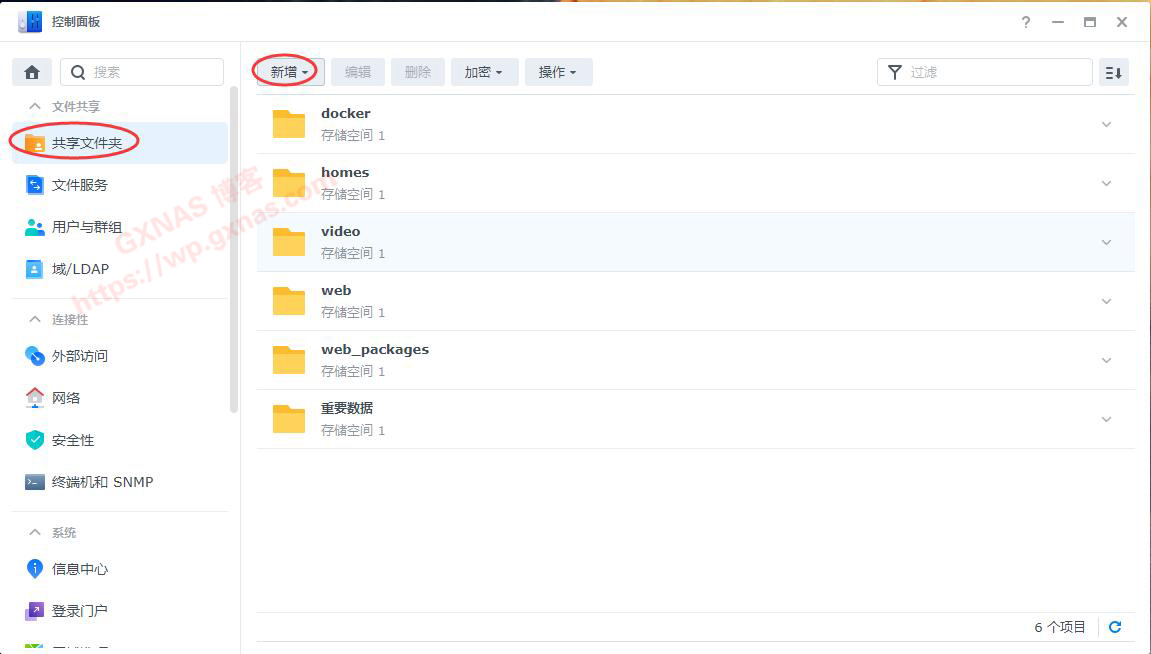 1、用电脑浏览器登录群晖,打开控制面板,共享文件夹,新增;
