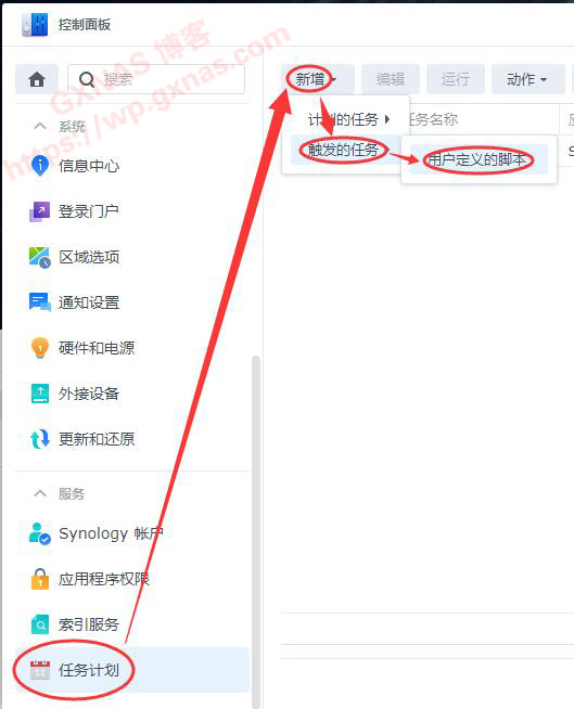 11、群晖控制面板,任务计划,新增,触发的任务,用户定义的脚本;
