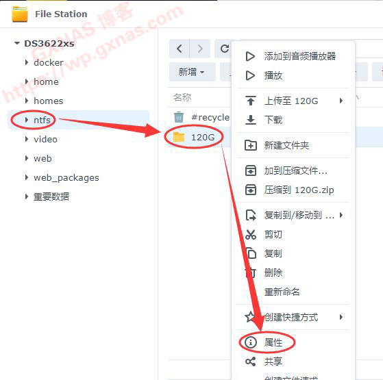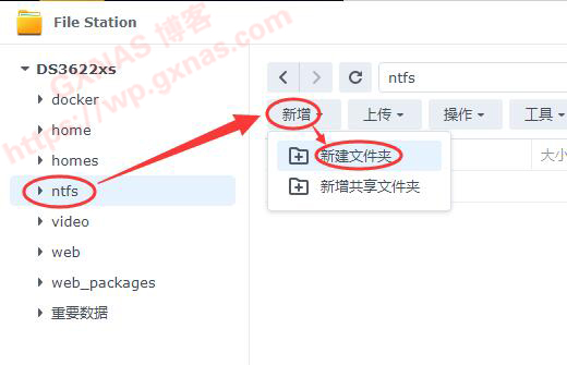 7、打开File Station,找到刚才建立的ntfs文件夹,点菜单上的“新增”—“新增文件夹”;
