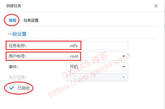 12、在“常规”标签页中,填写任务名称(我这写的是ntfs),用户账号改为root,在左下方的“已启动”处打勾;